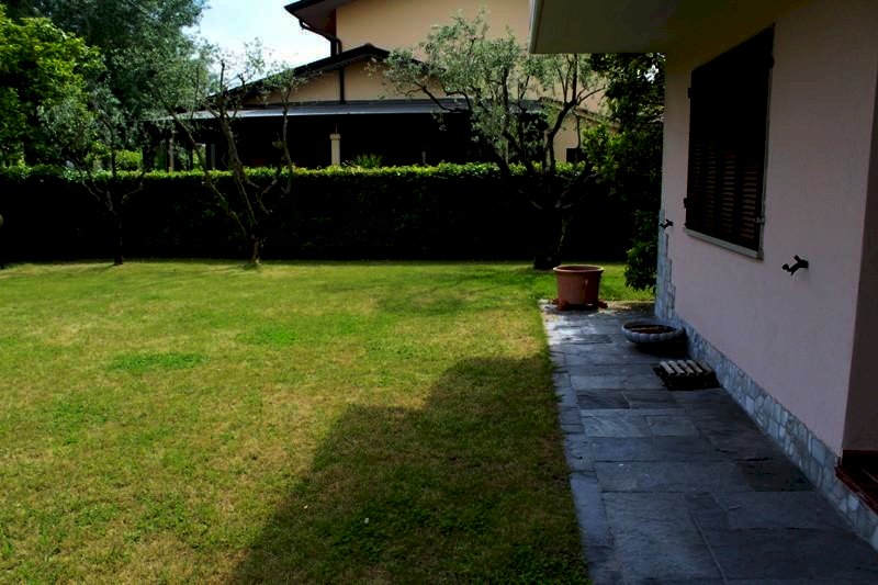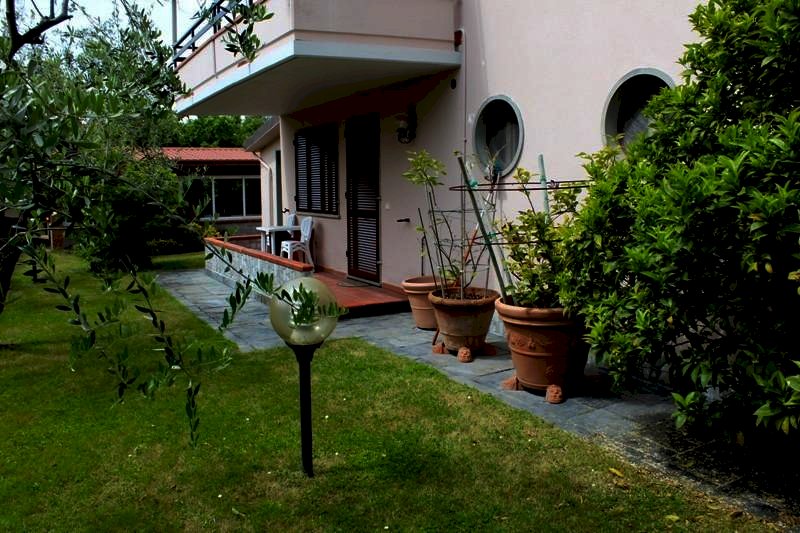 MARINA DI MASSA ZONA CENTRALE AD UNA DISTANZA DAL MARE DI 900 METRI IN ZONA VERDE E TRANQULLA, VENDESI PORZIONE DI BIFAMILIARE SOLEGGIATA TUTTO IL GIORNO, POSTA AL PIANO TERRA COMPOSTA DA INGRESSO SU SUGGIORNO CON TERRAZZO, DISIMPEGNO, DUE CAMERE MATRIMONIALI, BAGNO CON VASCA, AMPIO LOCALE AL PIANO SEMINTERRATO COLLEGATO DA SCALA INTERNA,, LOCALE LAVANDERIA CON DOCCIA ED AMPIO GIARDINO ESCLUSIVO DI CIRCA 400 MQ. CON IMPIANO DI IRRIGAZIONE AUTOMATICO E ROBOT TAGLIAERBA. VARI POSTI AUTO ESCLUSIVI.