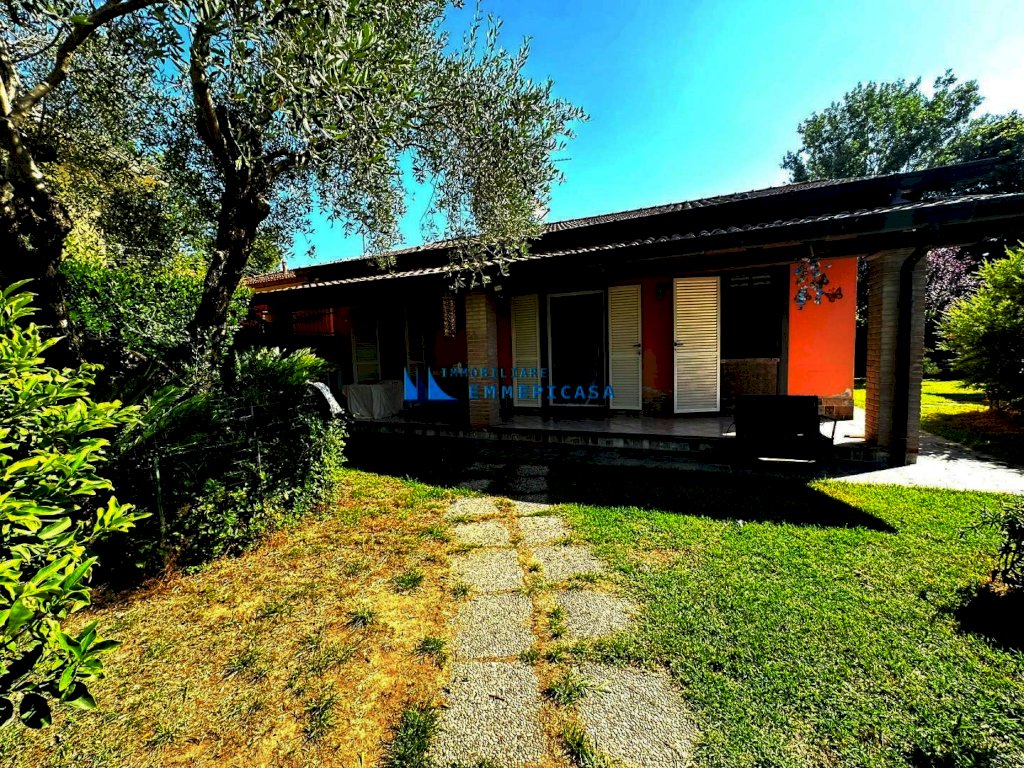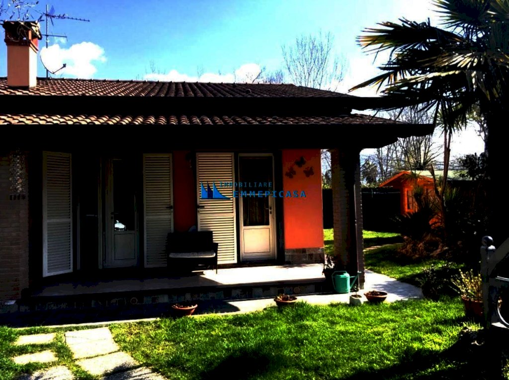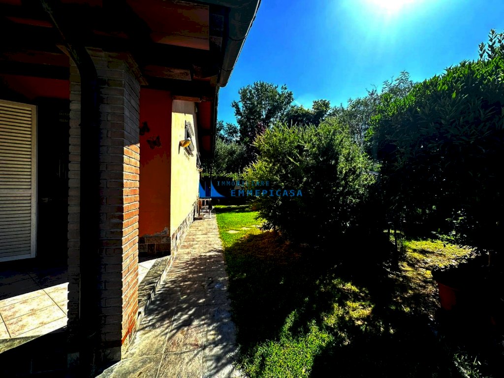 Poveromo. A circa 800 metri dal mare si vende porzione di villetta bifamiliare sviluppata su unico piano terra con bel giardino privato su tre lati. Ristrutturata recentemente si compone di ampio soggiorno con cucina a vista, disimpegno notte, una camera matrimoniale, una camera doppia ed ampio bagno. Portico per pranzare all'aperto, casetta in legno ad uso deposito, zona lavanderia sul retro dell'immobile e zona parcheggio per tre auto. Impianto di climatizzazione. Rich. € 399.000