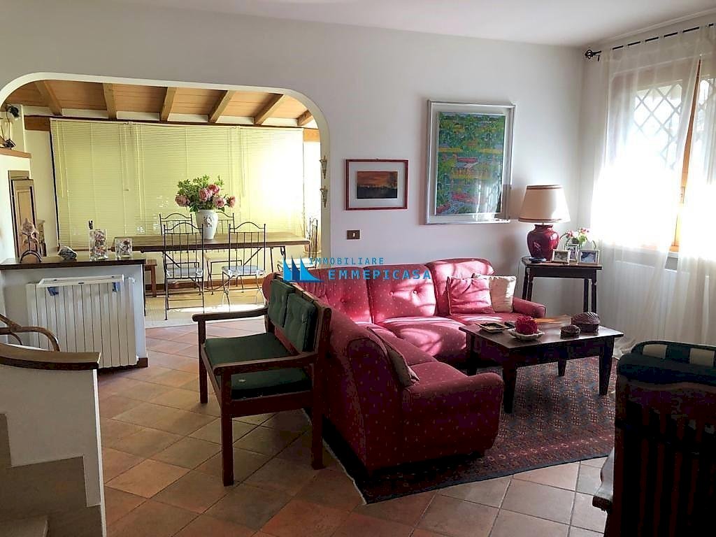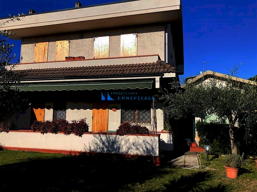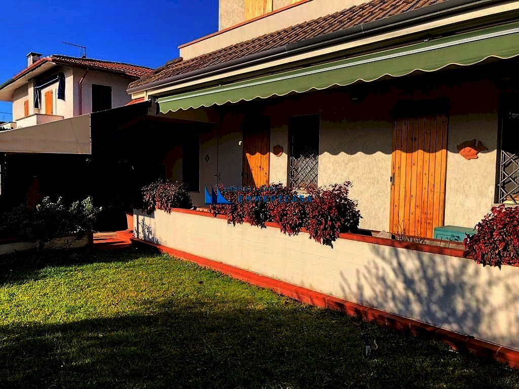 Cinquale. A circa 2 km dal mare in zona tranquilla e riservata si vende porzione di bifamiliare sviluppata su tre piani fuori terra e circondata da ampio giardino su tre lati con posto auto interno. Si compone di soggiorno con accesso a bella veranda chiusa, zona pranzo, cucina, lavanderia, ripostiglio e bagno a piano terra; Camera matrimoniale, camera doppia, camera singola e bagno oltre balconi a piano primo; Grande camera matrimoniale e bagno a piano sottotetto. Rich. € 500.000 Completamente arredata