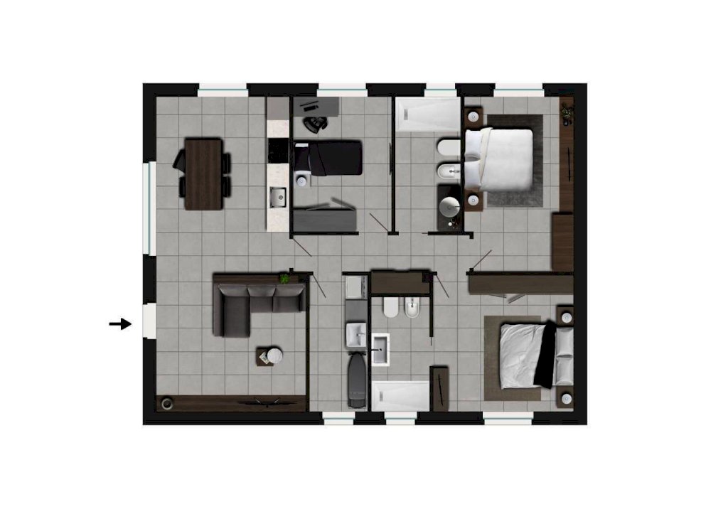 L'immobile è sviluppato tutto su un unico piano è di circa 115 m² commerciali, si compone di ampio e luminoso soggiorno con cucina a vista con accesso ad un bellissimo GIARDINO ESCLUSIVO di circa 345mq, disimpegno, due camere matrimoniali di cui una con bagno privato, una cameretta e ulteriore bagno finestrato. L'immobile dispone di due posti auto scoperti privati. Tempistiche di consegna entro giugno 2026. Ottima posizione e vicina ai servizi!!! Vende una società quindi immobile soggetto a iva al 4%.