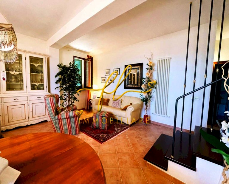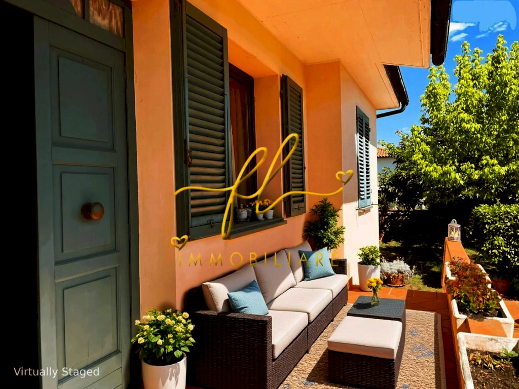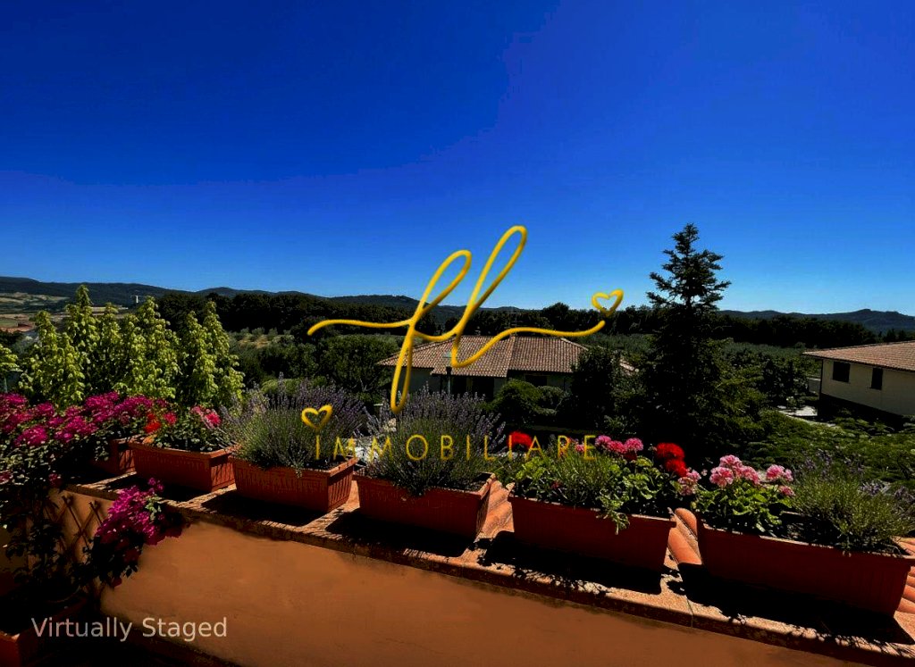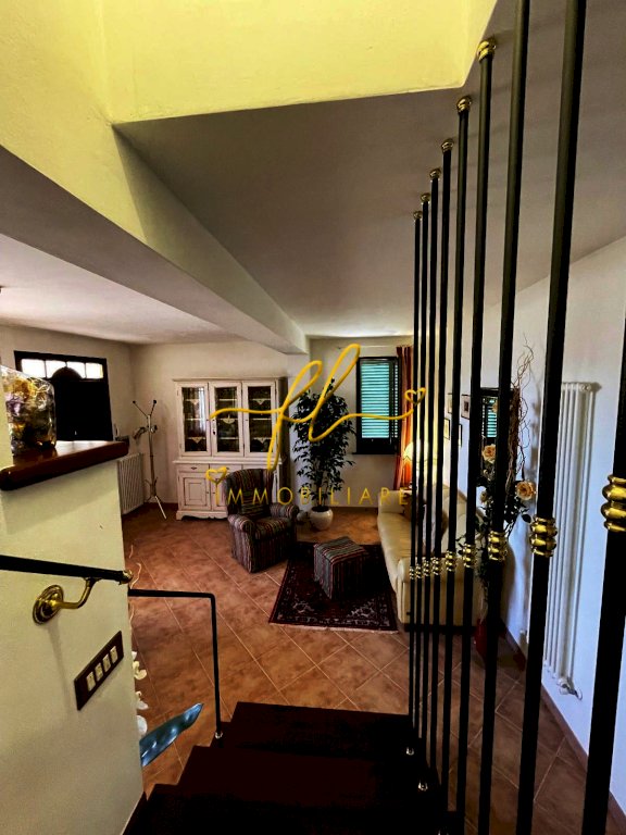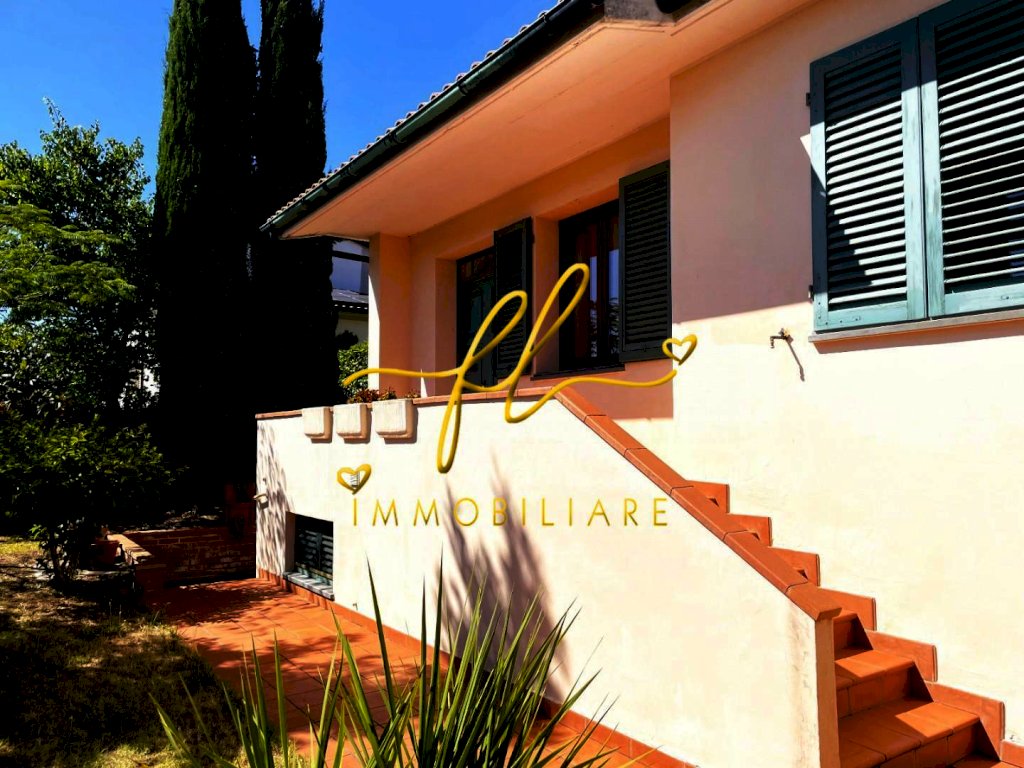 La casa, luminosa e spaziosa, si sviluppa su tre livelli offrendo vari ambienti . Il piano terra della villetta, rialzato e collegato al giardino tramite comoda scala esterna di pochi gradini è così distribuito: ingresso principale su salottino e zona pranzo giorno rivolta a sud, cucina con dispensa, ampia camere matrimoniale, bagno finestrato con doccia. Da scala a giorno si accede al primo piano dell'abitazione composto da ulteriore camera matrimoniale, secondo bagno finestrato anch'esso con doccia, ulteriore locale/studio da cui si accede da ampia porta a vetri su splendida terrazza a tasca da cui si gode uno splendido panorama sulle colline toscane. Al piano seminterrato, collegato da scala interna completano la proprietà taverna con accesso diretto al giardino, lavanderia, cantine e garage con accesso carrabile da strada laterale la proprietà.