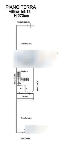 Villa situata a Roma, in via Carlo Cassola (RM), sviluppata su tre livelli: seminterrato, piano terra e primo piano. Al piano seminterrato sono presenti una cantina e un box auto; il piano terra ospita un soggiorno con angolo cottura, un bagno, un terrazzo e un giardino anteriore. Al primo piano si trovano due camere da letto, un bagno, un terrazzo, un balcone e un giardino posteriore. Completa la proprietà un garage di circa 28 mq e un posto auto di 13 mq.
