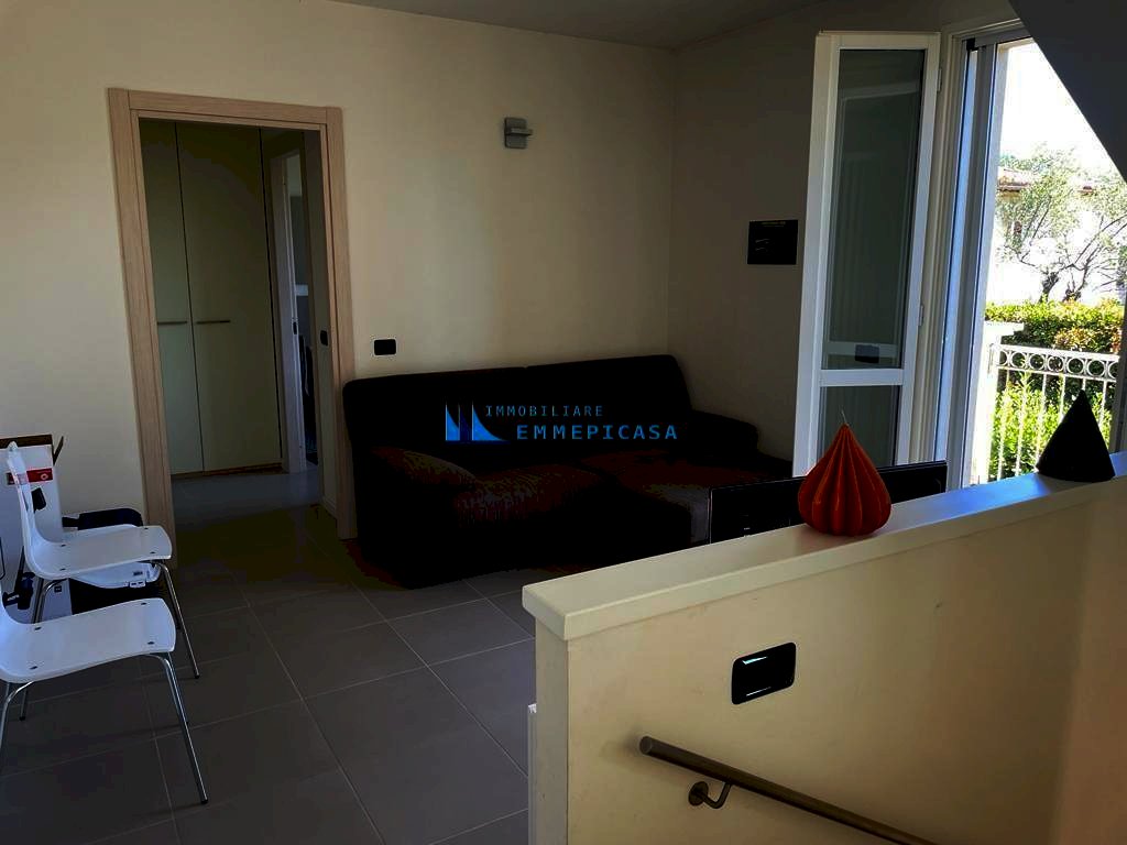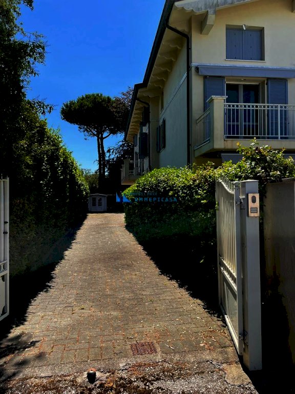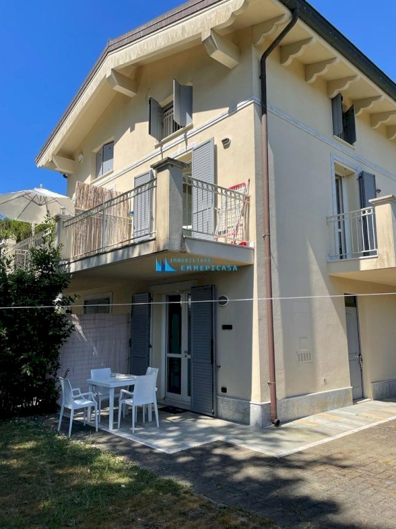 Cinquale. A soli 500 metri dal mare in fabbricato trifamiliare di recente costruzione si vende villa terratetto sviluppata su tre piani fuori terra e corredata da giardino esclusivo con diversi posti auto interni. Anche se unica unità immobiliare la villa è stata divisa in due appartamenti con impianti separati e ingressi indipendenti. Appartamento a piano terra composto da soggiorno con angolo cottura, disimpegno, camera matrimoniale, bagno con doccia e cameretta. Appartamento a piano primo composto da zona pranzo con angolo cottura e accesso diretto a terrazzo di generose dimensioni, soggiorno, disimpegno e bagno; Piano sottotetto con accesso da scala interna composto da due camere matrimoniali, cameretta, disimpegno e bagno con doccia. Aria condizionata, impianto di allarme, casetta in legno per attrezzi e arredamento completo compreso nel prezzo. Classe energetica: A1 - Rif. H754
